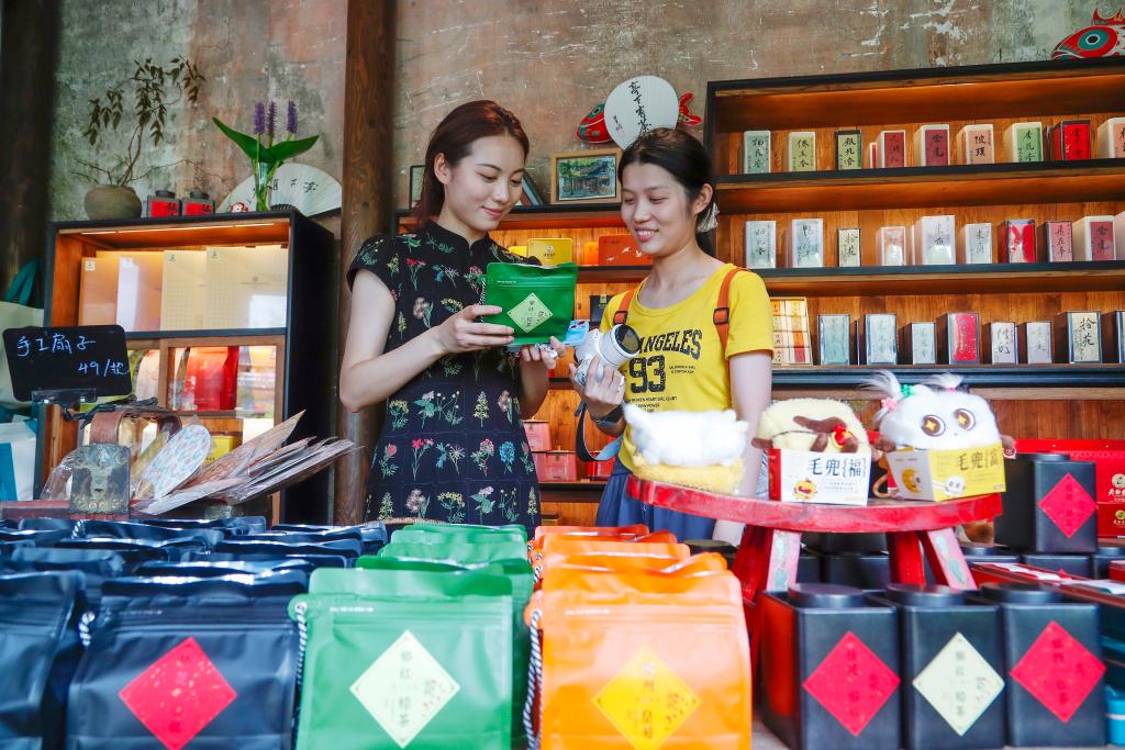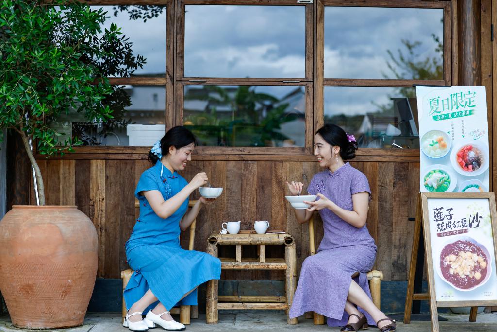 7月28日,在安徽省黄山市徽州区呈坎村,两名游客在一家糖水铺前交流。新华社发(施亚磊 摄)