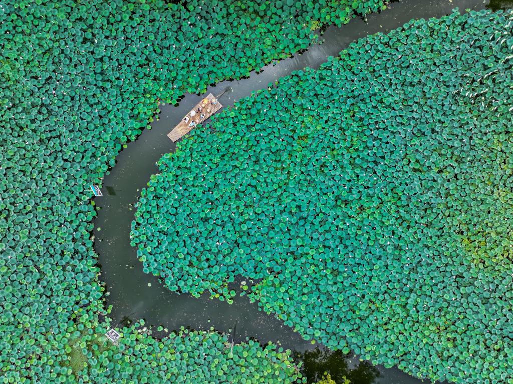 7月25日,在安徽省黄山市徽州区呈坎村,游客在永兴湖乘坐竹筏观赏风景(无人机照片)。新华社发(樊成柱 摄)