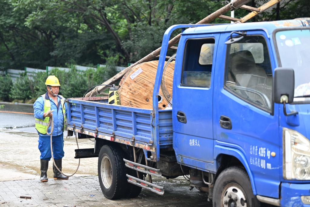 抢修人员在天津市蓟州区下营镇常州村准备修复光缆。新华社记者李然 摄