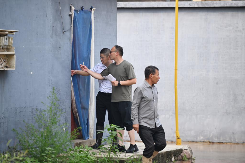 7月28日,张学超(左一)和同事们一道在下营村逐户进行转移动员工作。新华社记者李然 摄