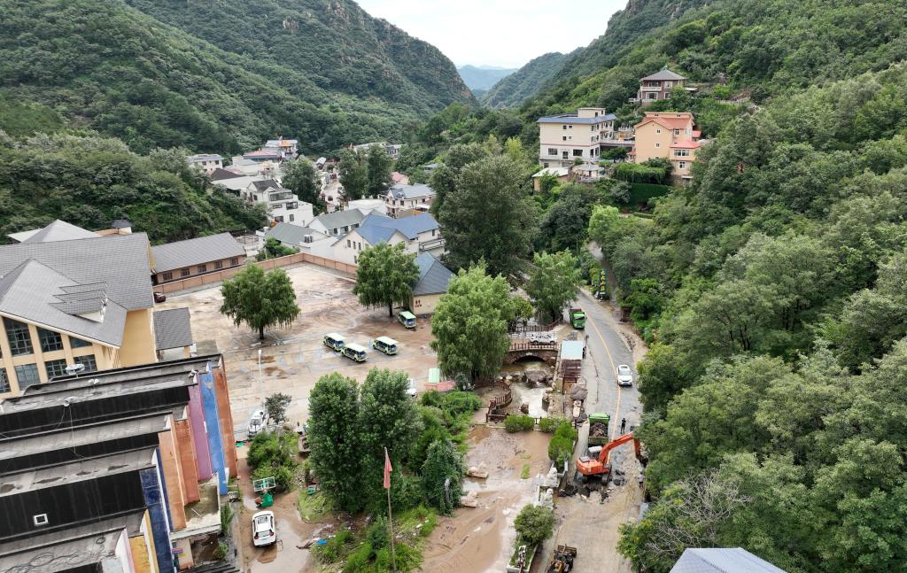 7月29日拍摄的工程车辆在天津市蓟州区下营镇常州村抢修道路(无人机照片)。新华社记者李然 摄