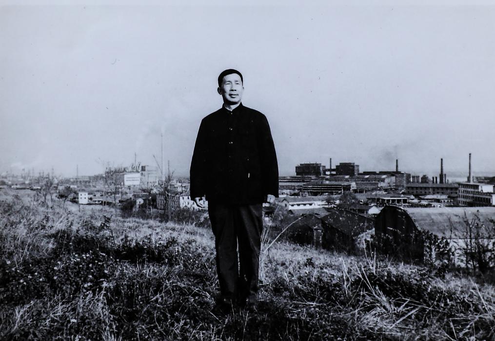 1974年,王生调入南京钢铁厂,在霸王山麓与厂房合影(翻拍照片)。