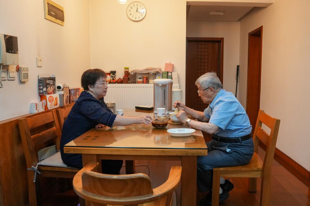 2025年7月11日,王生(右)与女儿王远在家里吃午饭。