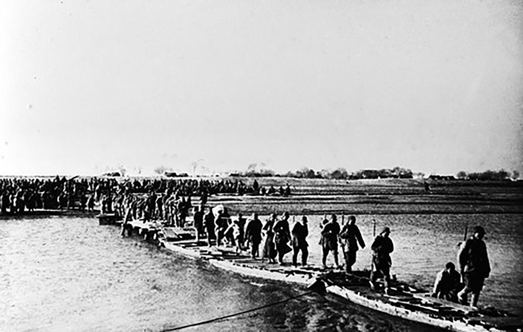 1945年9月,新四军参加淮阴战役的部队通过运河浮桥(资料照片)。新华社发