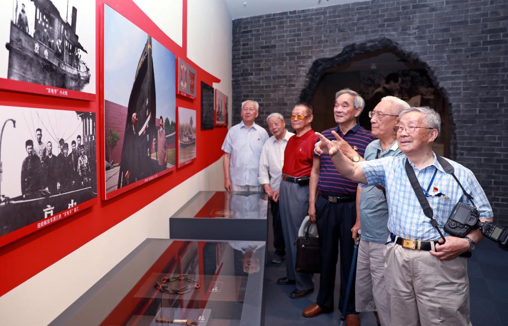 2019年7月4日,在南京渡江胜利纪念馆,王生(右一)与南钢离休老干部参观史料陈列展,庆祝新中国成立70周年。新华社发(吴斌 摄)