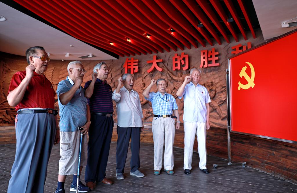2019年7月4日,在南京渡江胜利纪念馆,王生(右二)与南钢离休老干部重温入党誓词。新华社发(吴斌 摄)