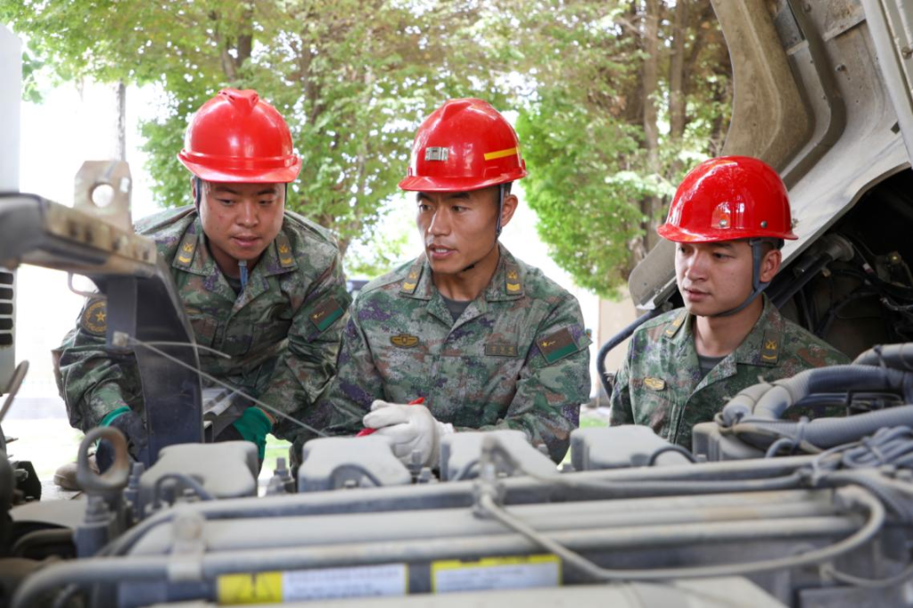 雷耀明(右二)向年轻战友讲解机具使用技巧。郑弘扬 摄