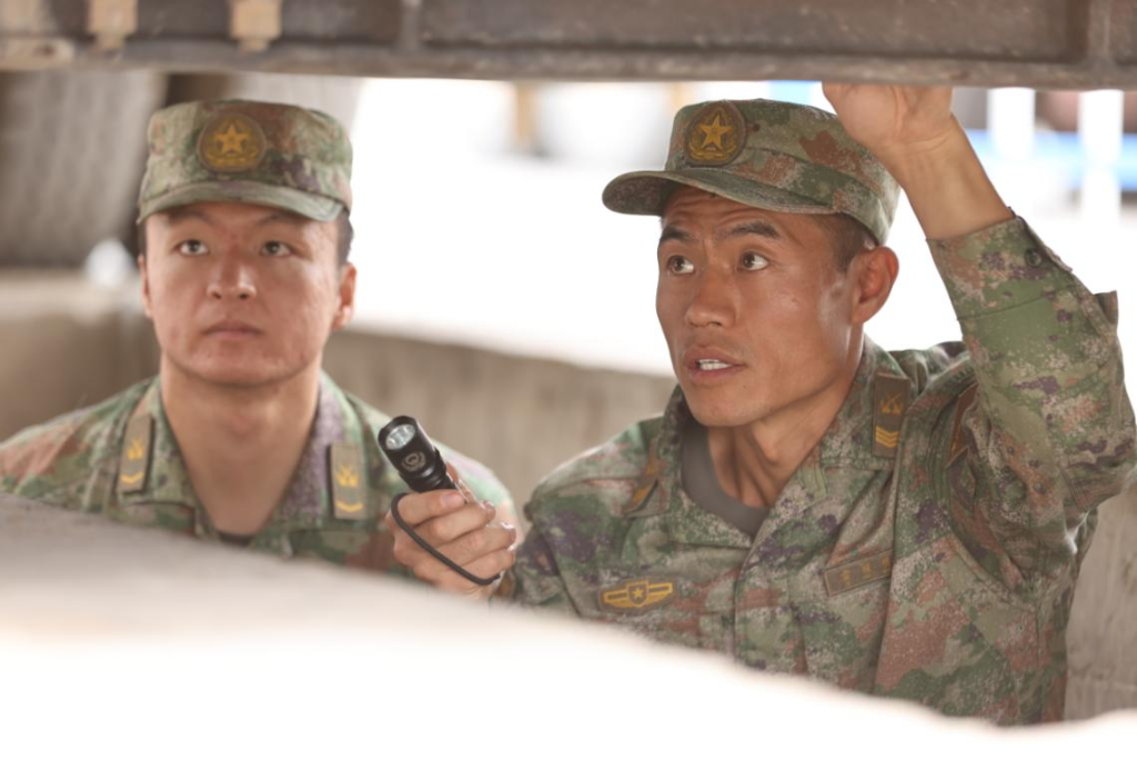 雷耀明(右)向年轻战友讲解装备保养相关知识。张翔 摄