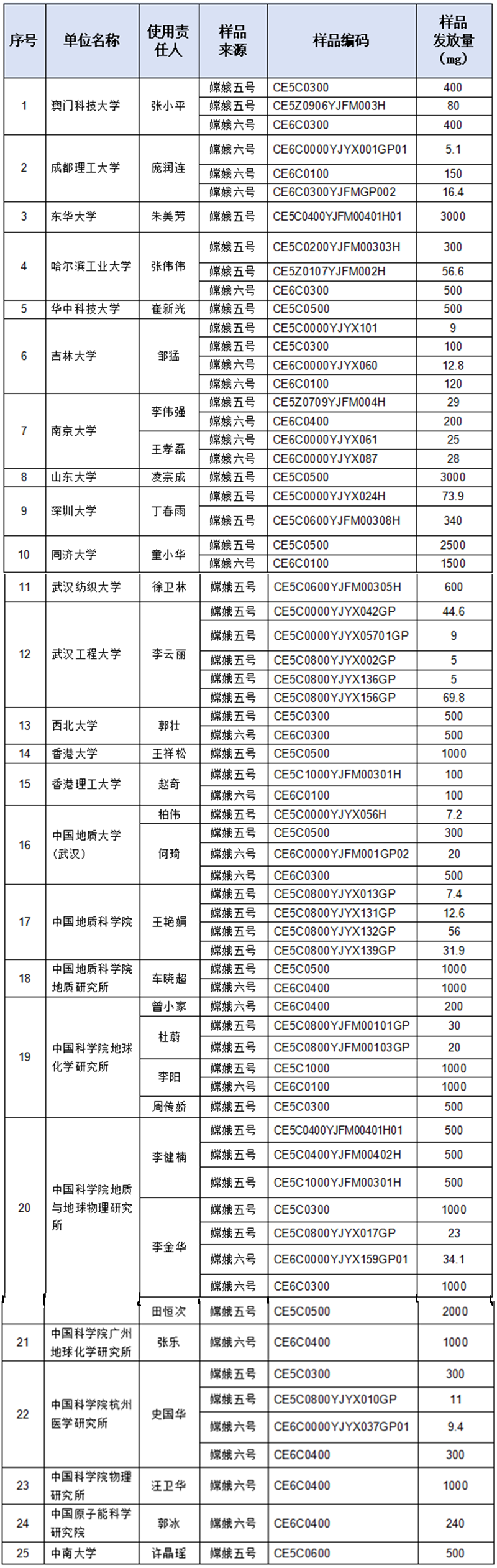 8月2日,中国探月工程发布关于发放国内第九批月球科研样品的公告。2025年7月,探月与航天工程中心组织召开了第九批月球科研样品借用申请评审会。经月球样品专家委员会评审,探月与航天工程中心审核并报国家航天局批准,最终25家科研机构的67份申请获得通过,对应32名使用责任人,样品发放量共计30881.8mg。