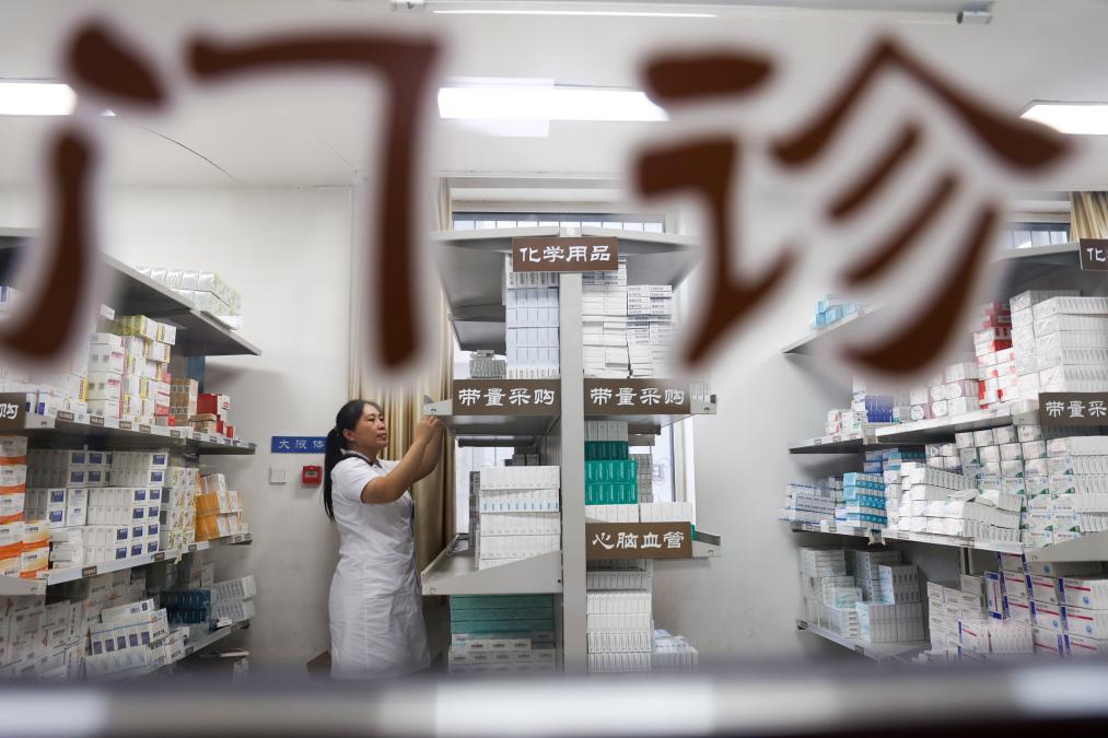 在河北省石家庄晋州市中医院,医务人员在门诊药房为患者取药。新华社发(贾再兴 摄)