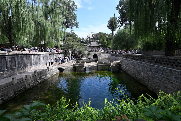 2025年8月7日,游客在晋祠难老泉排队观泉。新华社记者 詹彦 摄