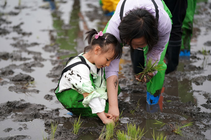 2024年5月4日,在太原市晋源区晋祠镇北大寺村的稻田里,小朋友和家长在体验插秧。新华社记者 詹彦 摄