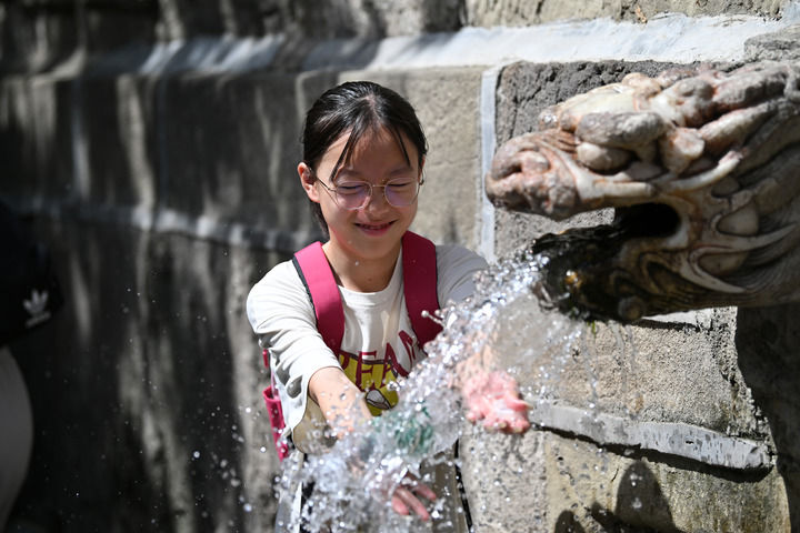 2025年8月7日,一名游客在晋祠难老泉感受泉水的清冽。新华社记者 詹彦 摄