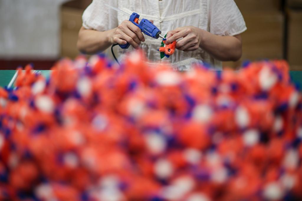 8月11日,在四川省达州市达川区景市镇红岩洞村诚兴外贸玩具加工厂,工人赶制出口欧美国家的订单背包熊猫挂件。新华社发(邓良奎 摄)