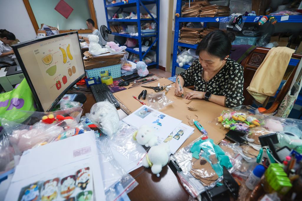8月11日,在广东东莞奇骏玩具工厂,工人根据图纸缝制包挂部件。新华社发(郑家雄摄)