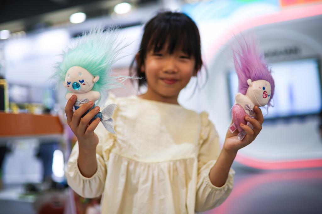 8月11日,在广东东莞举办的第十五届中国国际动漫博览会展会现场,小朋友展示包挂玩具。新华社发(郑家雄摄)