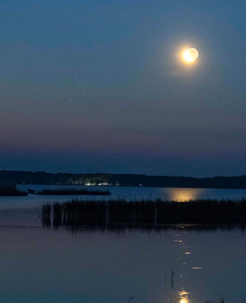 2025年6月23日,在黑龙江齐齐哈尔市克钦湖拍摄的月伴昴星团。(王勇刚 摄)