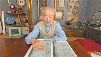 清水英男向记者介绍写有自己名字的《731部队留守名簿》。记者朱玥颖摄