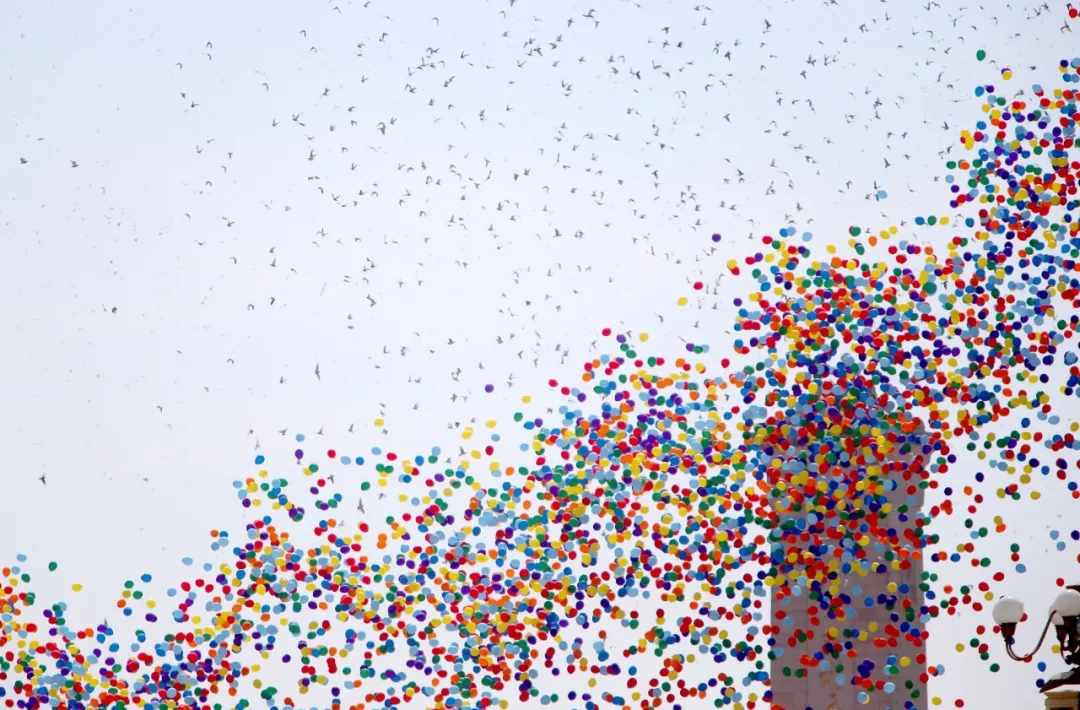 2015年9月3日,中国人民抗日战争暨世界反法西斯战争胜利70周年纪念大会在北京隆重举行。这是纪念大会现场放飞气球和白鸽。新华社记者 张加扬 摄