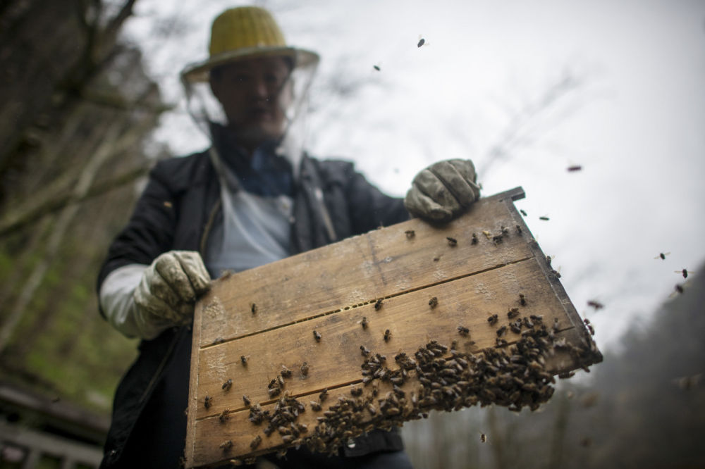 2024年4月10日,神农架林区中蜂养殖实训中心,工作人员查看蜂箱内蜜蜂状态。记者 伍志尊 摄