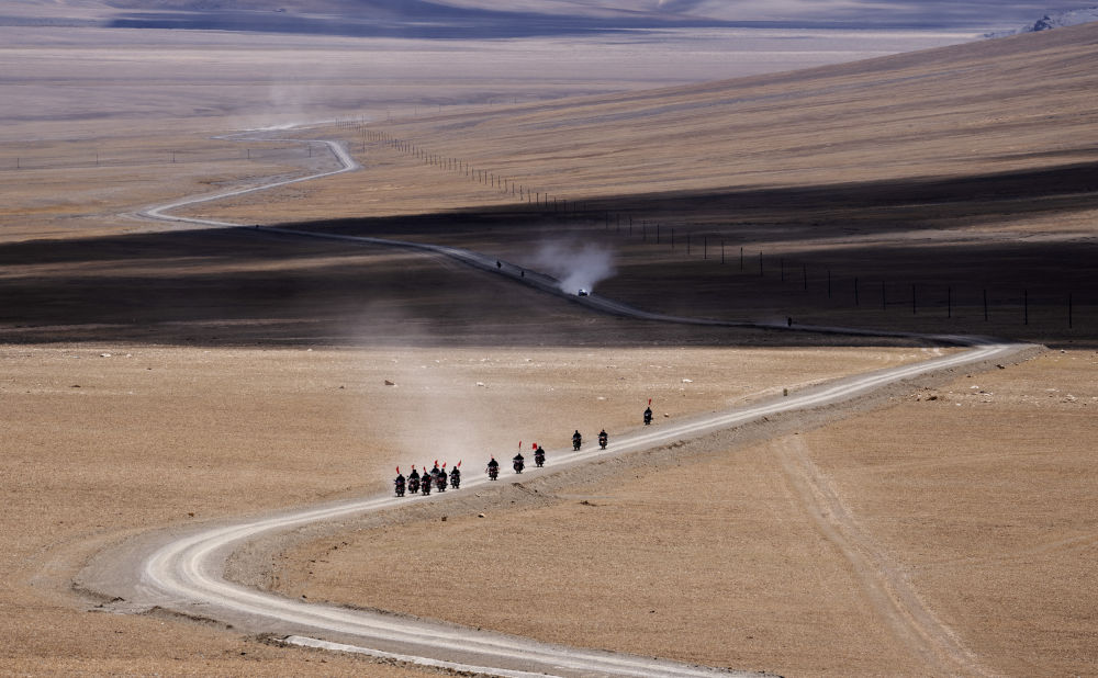 2023年6月2日,50岁的昌果护边联防队队长石角带领队员在日喀则市萨嘎县昌果乡骑着摩托车前往33号界桩巡逻。昌果乡是与尼泊尔接壤的边境乡,有105公里的边境线,5条通外山口。1996年,昌果边防工作站成立,石角主动申请成为一名联防队员。从1个到103个——27年间,这支由普通牧民组成的护边联防队不断壮大,让国旗飘扬在国境线的每个角落。