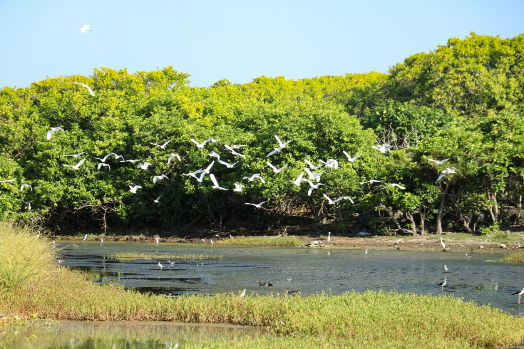 随着岛礁湿地公园的建成,经过净化处理后的生活污水滋养着芦苇、蒿草等水生植物,成为鸟类的天堂。