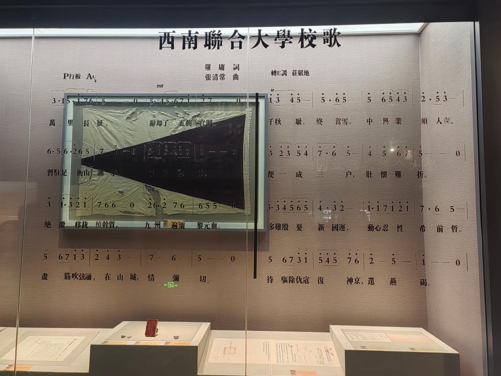 西南联大博物馆内陈列的西南联大校歌墙和校旗。新华社记者 荆昭延 摄