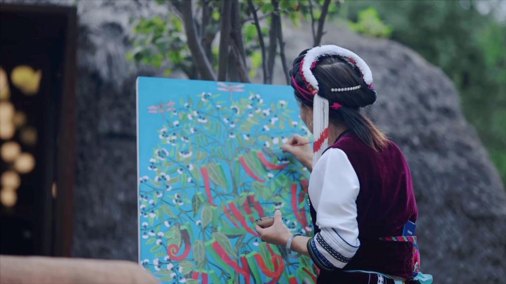 云南大理双廊镇伙山村有个农民画社,92岁的王秉秀老人从78岁起拿起画笔,把绣花的技法用到绘画上,将田间的耕耘、山间的景致、世代相传的民俗风情融入画作。