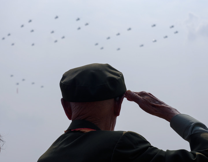 2025年9月3日,纪念中国人民抗日战争暨世界反法西斯战争胜利80周年大会在北京隆重举行。这是抗战老战士在天安门城楼上敬礼。新华社记者 才扬 摄