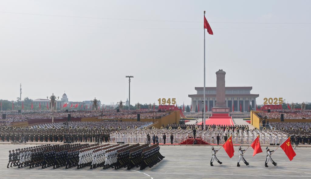 9月3日,纪念中国人民抗日战争暨世界反法西斯战争胜利80周年大会在北京隆重举行。这是国旗护卫队在行进中。新华社记者 费茂华 摄