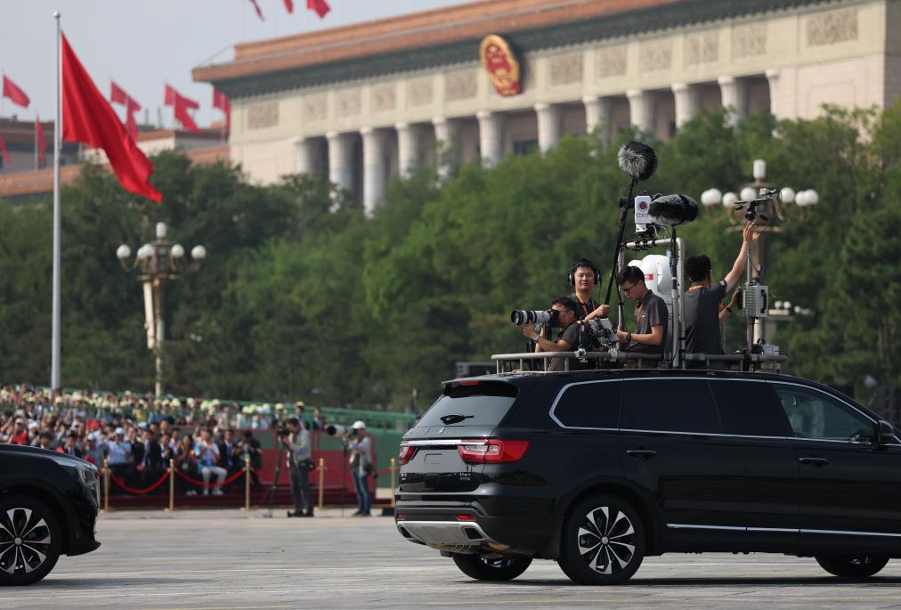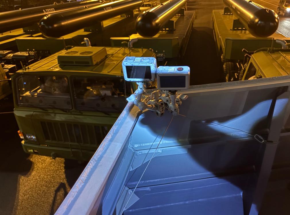 在纪念活动现场区域,新华社规划了60多个摄影点位,分布在天安门城楼、广场、长安街沿线等位置,这其中包括很多特殊的点位,比如在长安街沿线停放了三台消防云梯车,用于实现高空拍摄;在长安街中线地面安装遥控相机,用于拍摄装甲车从镜头上驶过的冲击力视角;在战斗机上安装自动拍摄的运动相机,从飞行员的视角记录空中受阅梯队。