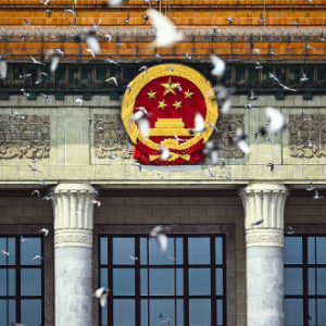 新华社记者马宁在人民大会堂楼顶拍摄。 新华社记者 杨子春 摄