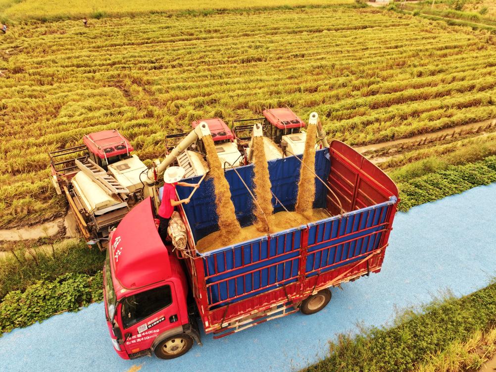 近日,四川省达州市渠县有庆镇太阳村农民转运刚收获的水稻(无人机照片)。白露节气之际,各地农民抢抓农时,田间地头一片农忙景象。新华社发(邓良奎 摄)