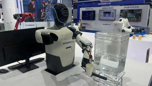 新松智能类人双臂平台正在进行接水操作。新华网 孙丽颖 摄