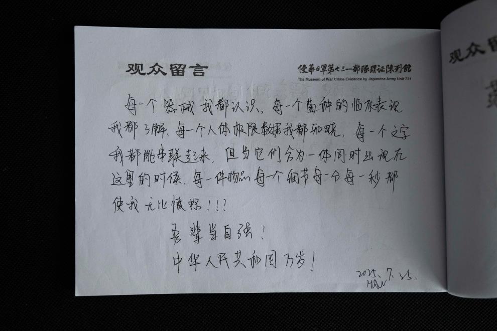 一名参观者在侵华日军第七三一部队罪证陈列馆留言。新华社记者 张玥 摄