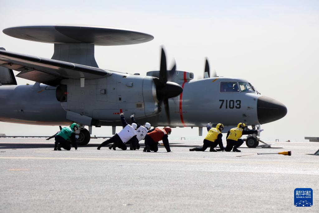 福建舰航空保障人员引导空警-600舰载预警机飞行员展开机翼(资料照片)。新华社发(姜涛摄)