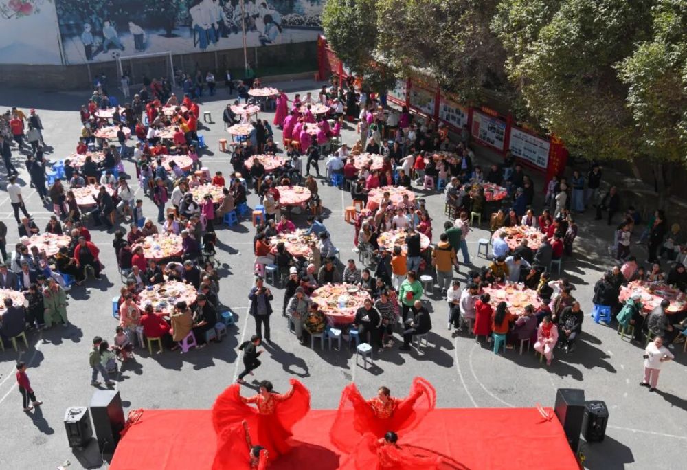 人们在乌鲁木齐市天山区固原巷社区举办的活动中品尝百家宴,欣赏文艺演出。新华社记者 王菲 摄