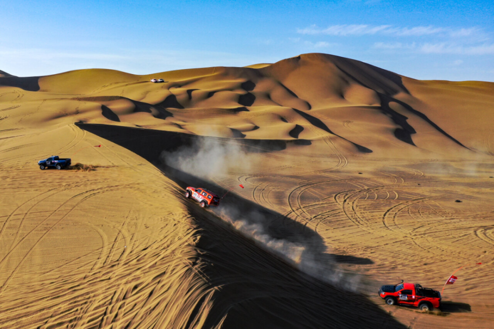 赛车在库木塔格沙漠里驰骋(无人机照片)。周鹏 摄