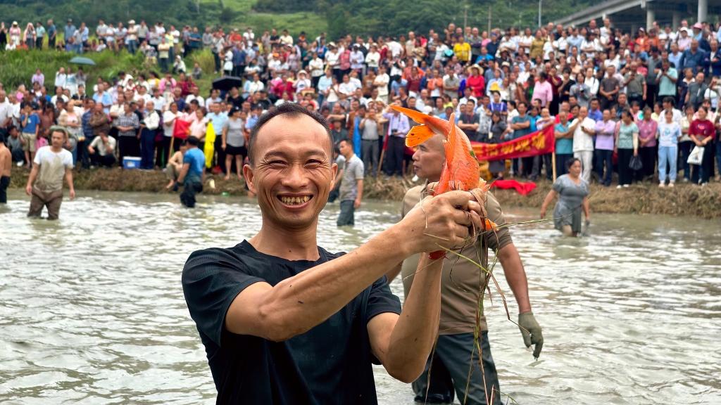 9月22日,在广西南丹县芒场镇巴平村举行的庆祝丰收节活动上,村民展示抓到的锦鲤。新华社发(高东风摄)