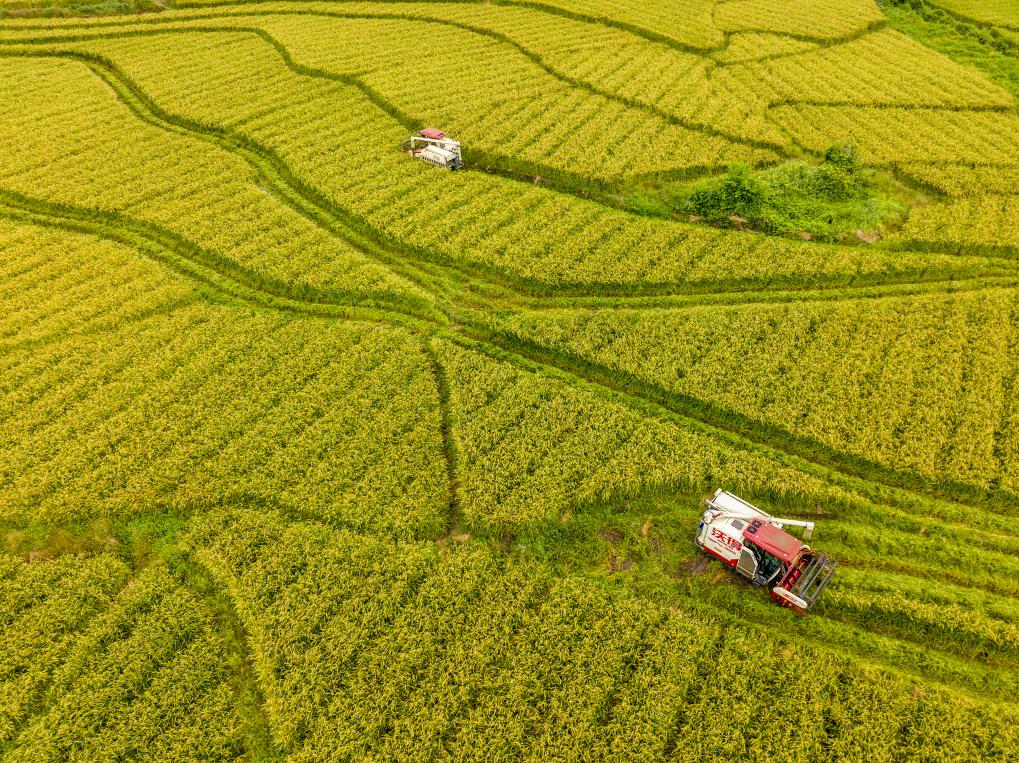 近日,在广西贺州市钟山县红花镇古楼村,农民驾驶收割机在收割稻谷(无人机照片)。新华社发(何华文摄)