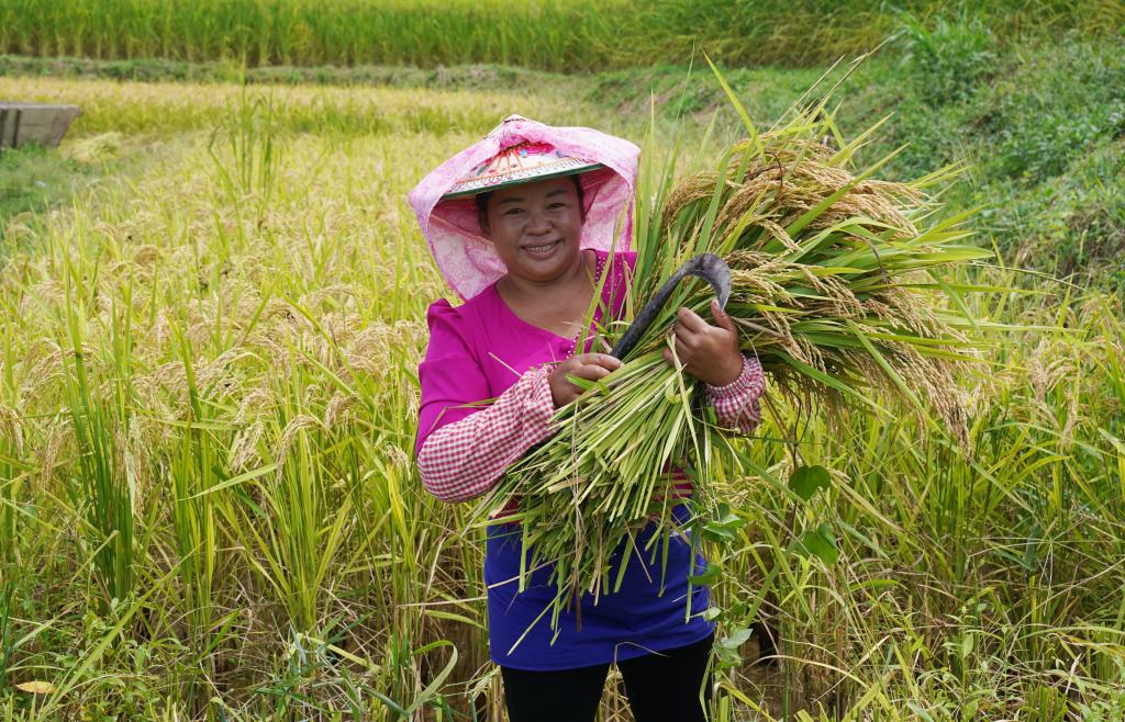 9月22日,在云南省德宏傣族景颇族自治州芒市遮放贡米种植基地,村民展示收获的稻谷。金秋时节,各地农民在田间地头忙碌,脸上洋溢着丰收的喜悦。新华社发(梁志强摄)