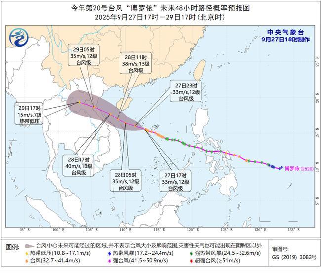 预计,“博罗依”将以每小时20-25公里的速度向西偏北方向移动,强度逐渐增强,向海南岛以南海面靠近,并将于28日白天掠过上述海面,之后将于28日夜间在越南中北部沿海登陆,以后逐渐减弱。预计“博罗依”在海南岛以南海面的最大强度可达台风级(35-40米/秒,12-13级),但也不完全排除达到强台风级的可能。