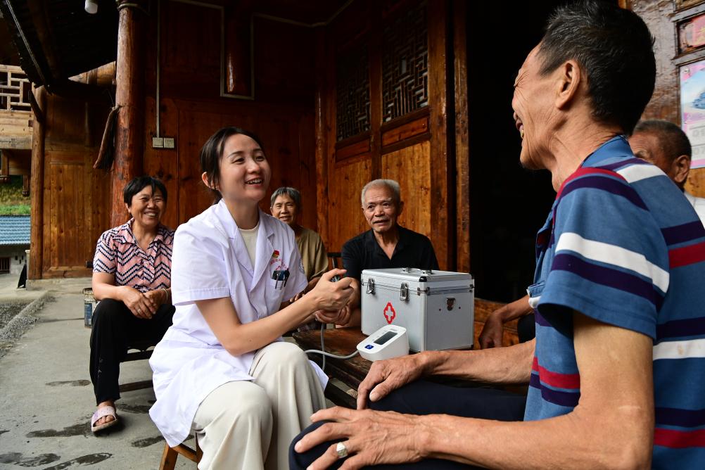8月11日,在重庆市酉阳土家族苗族自治县天馆乡魏市村,重庆市酉阳县天馆乡卫生院医生敖林叔给村民量血压。新华社发(冉川摄)
