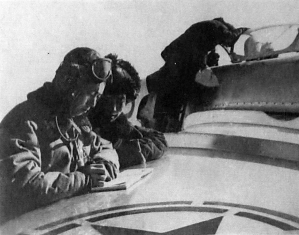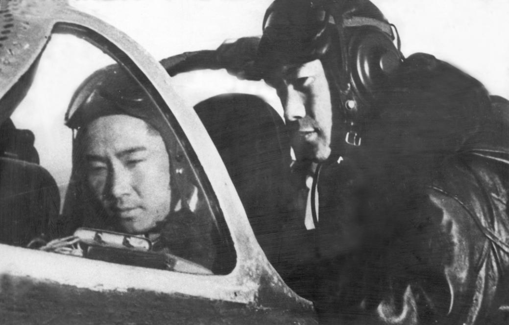 ↑志愿军航空兵某团两名飞行员一同研究装备。(资料照片)