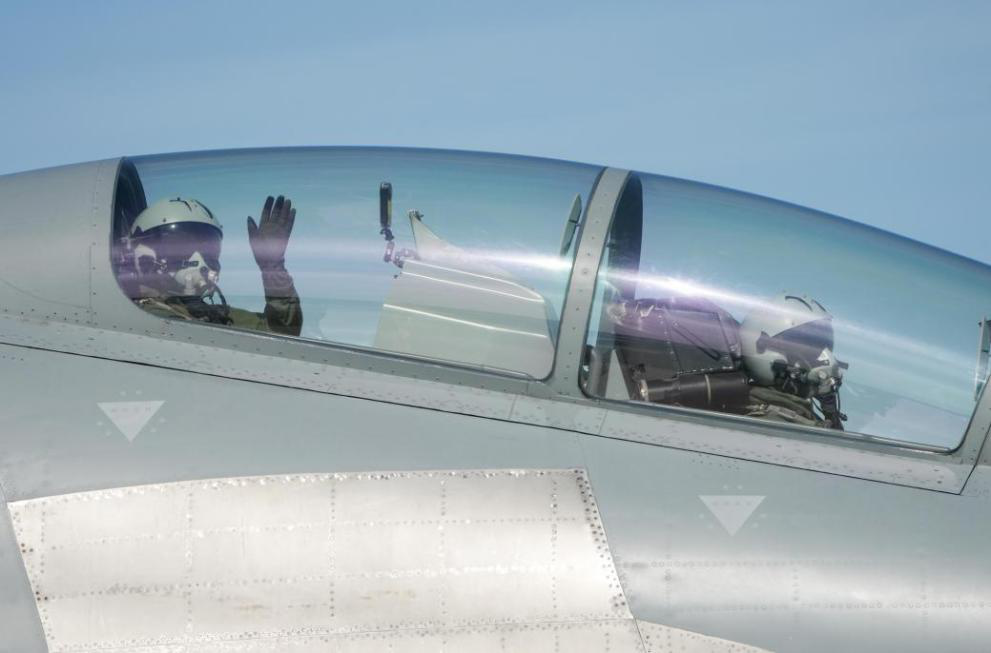 ↑2025年9月19日,歼-16飞行员在完成表演后向观众挥手致意。(新华社记者 颜麟蕴 摄)