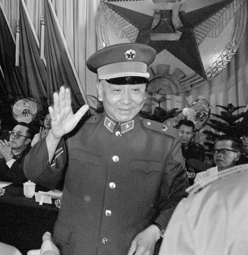 ↑1987年10月11日,时任空军司令员王海向功臣代表祝贺。(新华社记者 熊春雷 摄)