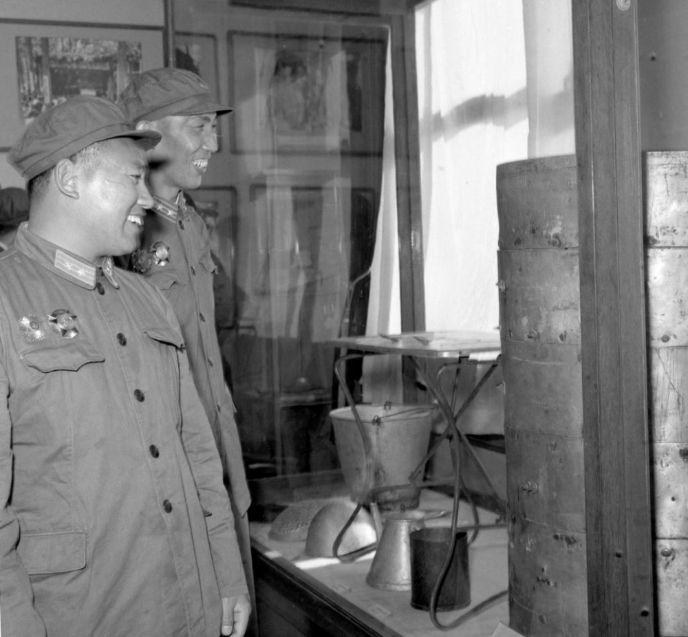 ↑1960年6月21日,张积慧(左)参观抗美援朝馆内展出的中国人民志愿军战士用被他们击落的美国飞机的残骸制成的餐具等物。(张赫嵩 摄)