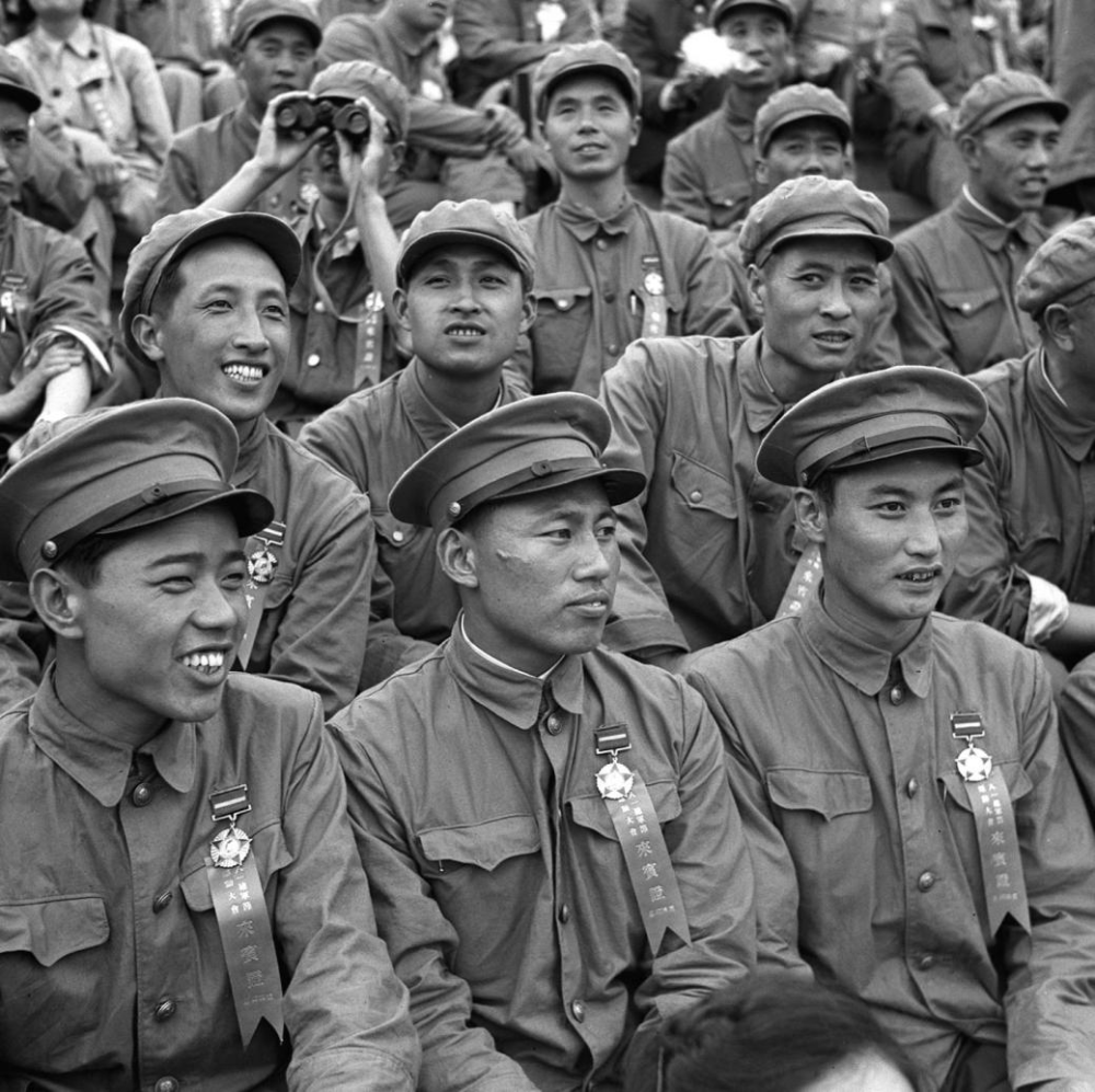 ↑这是1952年8月1日在“八一”体育运动大会看台上的中国人民志愿军代表团,前排左一为赵宝桐。(袁苓 摄)