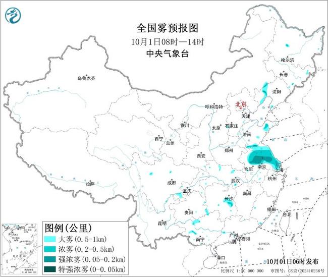预计,10月1日早晨至上午,山东西南部和东部、江苏、安徽东北部、上海、湖南中部、辽宁西部等地的部分地区有大雾,局地有能见度低于200米的强浓雾。