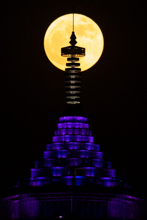 由于地球自转,月亮是东升西落。通常,月亮刚升起或即将落下时,其与地面的相对位置较低,适合通过前景元素增加照片的层次感和深度,拍摄景物和一轮明月的“合影”。如果你能用上长焦镜头配单反相机,或是变焦范围很大的手机,拍出这样的照片并不难。